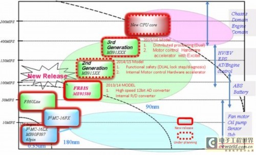 作为传统消费和工业电机控制方案的全球主要供应商,富士通在新能源汽车电机控制上也走在了前列,其32位电机控制MCU MB91F267NA已经取得不少成功应用。日前,富士通再次针对新能源汽车对电机控制的独特需求,发布了3款电动汽车电机控制MCU MB91580系列。作为高性能32位闪存嵌入微控制器(MCU)的FR家族成员,该系列产品可广泛应用于电动汽车和混合动力汽车的电机控制。该系列节能汽车驱动电机控制芯片拥有专用嵌入旋转变压器感应器接口,能够开拓性地控制电动汽车和混合动力汽车中使用的三相电机。