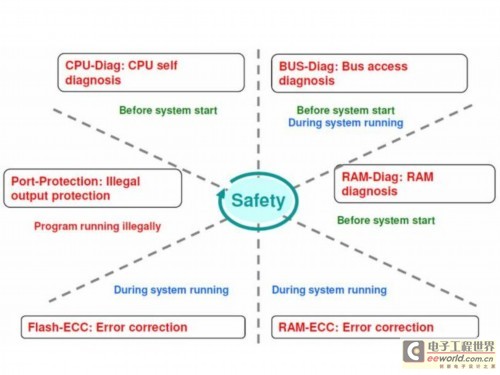 作为新能源汽车的核心部件。电机控制不仅关系着整车性能还与行车安全息息相关。在富士通的电机控制MCU设计中充分考虑了安全特性,通过6大安全机制来保证系统运行的安全可靠,包括:在系统启动前进行MCU的自我诊断、总线自诊断、RAM的自诊断;程序非法运行时非法输出端口保护;系统运行期间进行总线诊断、RAM错误纠正、闪存错误纠正。据透露,富士通在未来的产品计划中,还将增加核心MCU的冗余设计(例如双核或多核)以实现更强的系统保护。